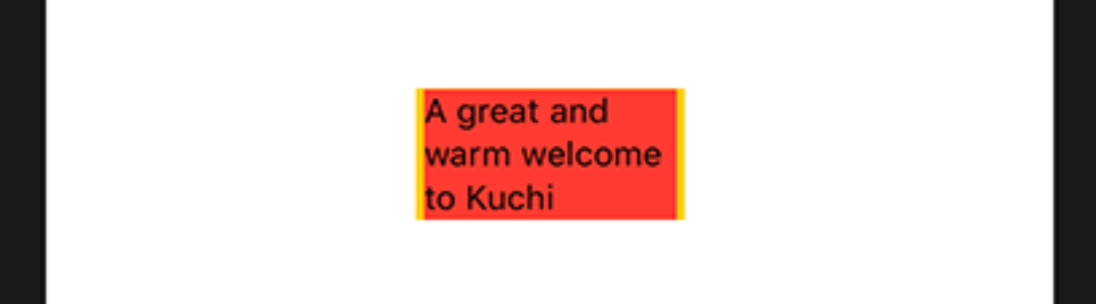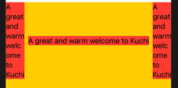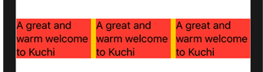 HStack { Text("A great and warm welcome to Kuchi") .background(Color.red) Text("A great and warm welcome to Kuchi") .background(Color.red) Text("A great and warm welcome to Kuchi") .background(Color.red) } .background(Color.yellow)
