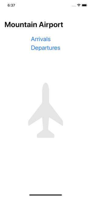// 1 NavigationView { ZStack { Image(systemName: "airplane") .resizable() .aspectRatio(contentMode: .fit) .opacity(0.1) .rotationEffect(.degrees(-90)) .frame(width: 250, height: 250, alignment: .center) VStack(alignment: .leading, spacing: 5) { // 2 NavigationLink(destination: FlightBoard( boardName: "Arrivals")) { // 3 Text("Arrivals") } NavigationLink(destination: FlightBoard( boardName: "Departures")) { Text("Departures") } Spacer() } .font(.title) .padding(20) // 4 } .navigationBarTitle(Text("Mountain Airport")) }