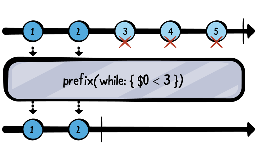 let numbers = (1...10).publisher numbers .prefix(while: { $0 < 3 }) .sink(receiveCompletion: { print("Completed with: \($0)") }, receiveValue: { print($0) }) .store(in: &subscriptions)1 2 Completed with: finishedprefix(until:_)