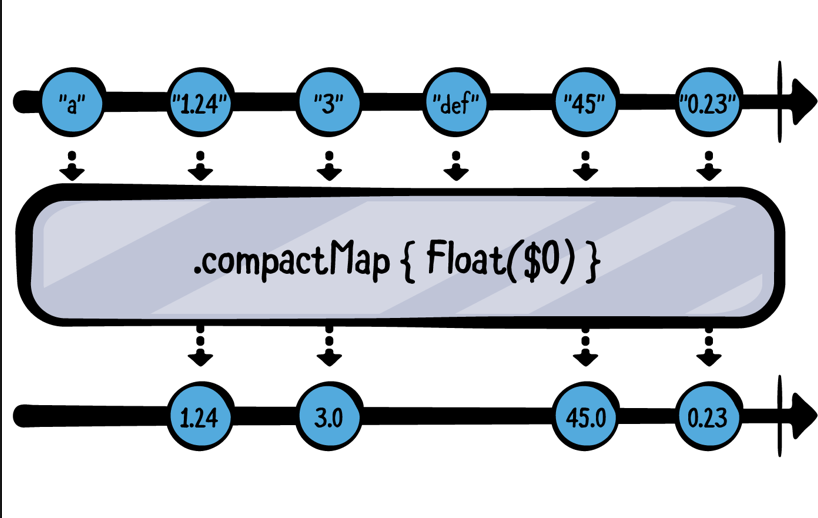 let strings = ["a", "1.24", "3", "def", "45", "0.23"].publisher strings .compactMap { Float($0) } .sink(receiveValue: { print($0) }) .store(in: &subscriptions)1.24 3.0 45.0 0.23ignoreOutput()