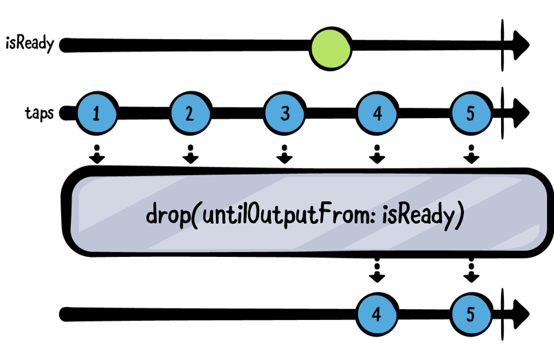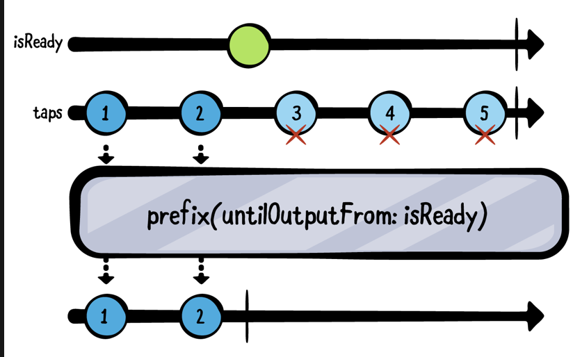et isReady = PassthroughSubject<Void, Never>() let taps = PassthroughSubject<Int, Never>() taps .drop(untilOutputFrom: isReady) .sink(receiveValue: { print($0) }) .store(in: &subscriptions) (1...5).forEach { n in taps.send(n) if n == 3 { isReady.send() } }4 5Limiting values