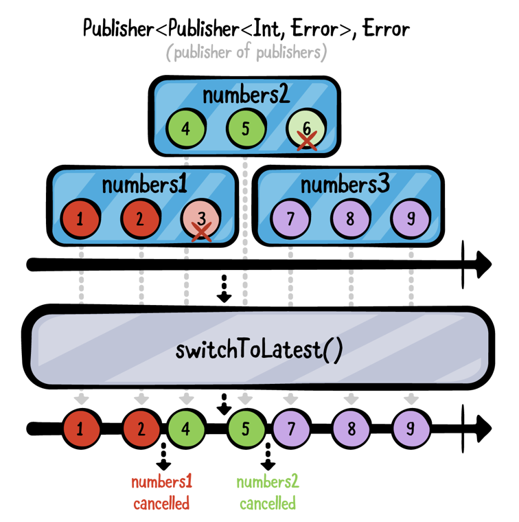 let publisher1 = [1, 2].publisher let publisher2 = [3, 4].publisher publisher1 .append(publisher2) .sink(receiveValue: { print($0) }) .store(in: &subscriptions)1 2 3switchToLatest