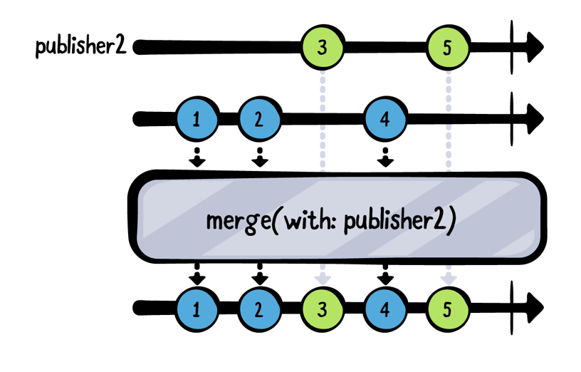 let publisher1 = PassthroughSubject<Int, Never>() let publisher2 = PassthroughSubject<Int, Never>() publisher1 .merge(with: publisher2) .sink(receiveCompletion: { _ in print("Completed") }, receiveValue: { print($0) }) .store(in: &subscriptions) publisher1.send(1) publisher1.send(2) publisher2.send(3) publisher1.send(4) publisher2.send(5) publisher1.send(completion: .finished) publisher2.send(completion: .finished)1 2 3 4 5 CompletedcombineLatest