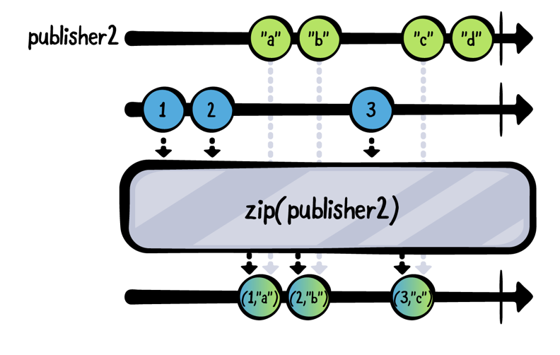 let publisher1 = PassthroughSubject<Int, Never>() let publisher2 = PassthroughSubject<String, Never>() publisher1 .zip(publisher2) .sink(receiveCompletion: { _ in print("Completed") }, receiveValue: { print("P1: \($0), P2: \($1)") }) .store(in: &subscriptions) publisher1.send(1) publisher1.send(2) publisher2.send("a") publisher2.send("b") publisher1.send(3) publisher2.send("c") publisher2.send("d") publisher1.send(completion: .finished) publisher2.send(completion: .finished)P1: 1, P2: a P1: 2, P2: b P1: 3, P2: c Completed'Ray Wenderlich > Combine' 카테고리의 다른 글