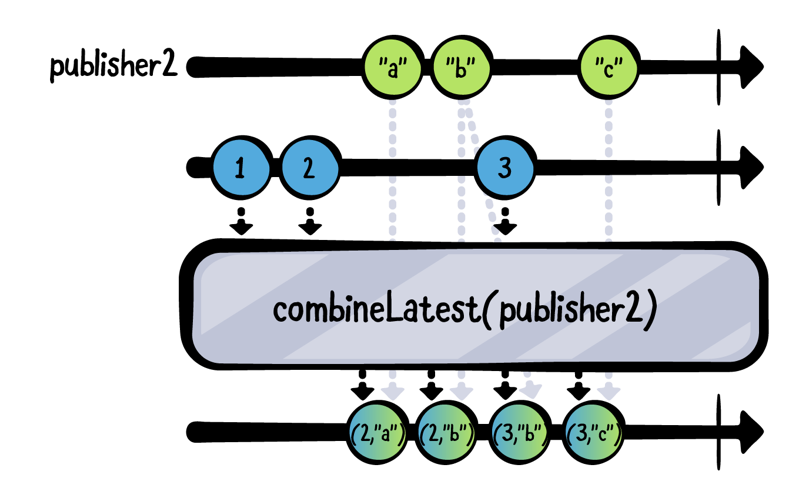 let publisher1 = PassthroughSubject<Int, Never>() let publisher2 = PassthroughSubject<String, Never>() publisher1 .combineLatest(publisher2) .sink(receiveCompletion: { _ in print("Completed") }, receiveValue: { print("P1: \($0), P2: \($1)") }) .store(in: &subscriptions) publisher1.send(1) publisher1.send(2) publisher2.send("a") publisher2.send("b") publisher1.send(3) publisher2.send("c") publisher1.send(completion: .finished) publisher2.send(completion: .finished)P1: 2, P2: a P1: 2, P2: b P1: 3, P2: b P1: 3, P2: c Completedzip