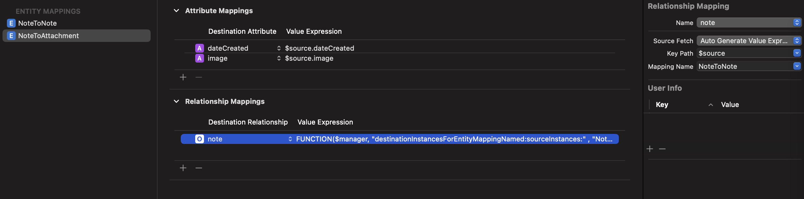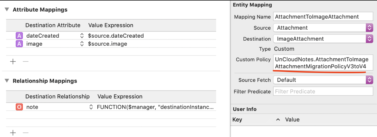 Mapping model에 커스텀 로직을 추가해야 한다면 NSEntityMigrationPolicy를 상속받아 코드를 작성할 수 있다. createDestinationInstances메소드를 오버라이드하여 로직을 작성하고 Mapping model에는 NSEntityMigrationPolicy의 서브클래스로 선언한 클래스의 경로를 작성해주면 된다.